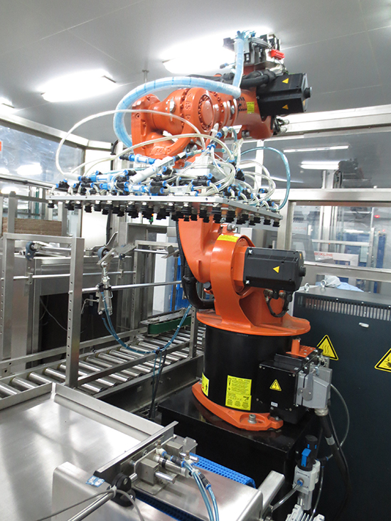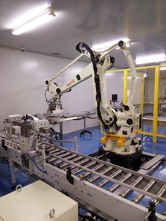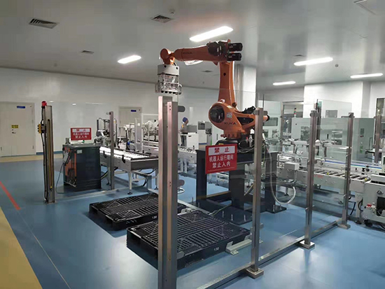 2、生产线中,机器人装箱可以灵活布局,可以一机多用:一机对多线、一机对多种产品,实现无人化生产车间的生产模式。