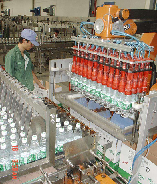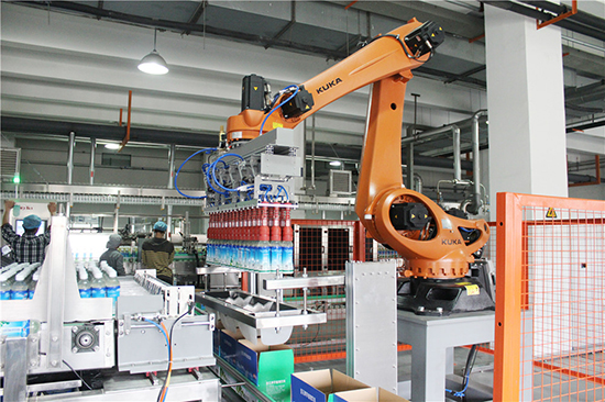 JCZX30R全自动机器人装箱机是采用国际先进的搬运机器人;本系统通过与其它设备组成包装生产线。可将PET饮料瓶或其它类似物品自动排列、集合整排、然后用抓取装置将包装物装箱,然后经输送、封箱等流程形成集合包装。可大大地减少劳动力和降低劳动强度,提升企业的生产线管理水平。