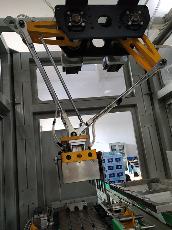 将输送过来的瓶(或盒子)整理排列为规定形式后,输送到并联机器人抓手处,抓手动作将排列好的瓶子(或盒子)抓起,再水平移动,装入到空箱输送定位好的箱子中,装完后箱子输出,整个过程流畅、简捷明了。装箱速度可以达15-18箱/分。