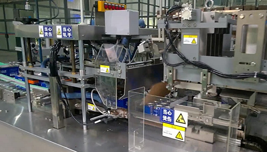 将输送过来的瓶整理排列为规定形式后,输送到供箱装置提供过来的箱上,再水平移动,形成左、右的成形,喷胶,封合等自动包装过程。特别适用易拉罐的纸板裹包式装箱,包装速度可以达30包/分。