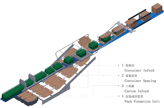 ●由于箱纸片和瓶跺在水平面上完成裹包,效率更容易保证;